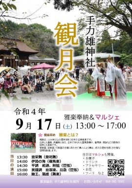 観月会では、月を愛でる機会として雅楽奉納、マルシェを行い、音楽と秋の恵みを奉納いたします。
