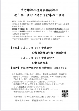 3月19日(日)14:00より境内社稲荷神社初午祭を斎行いたします。