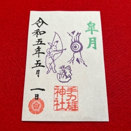 皐月の特別御朱印は弓術奉納する様子を描いております。