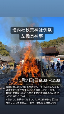 昨年受けられた御札御守を感謝の念を込めてお焚き上げし新しい年内の火防防災と、無病息災を祈る神事です。