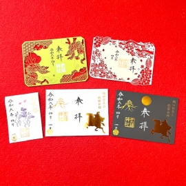 卯月の御朱印は、桜の中鳳輦を担ぐようすを描いています。