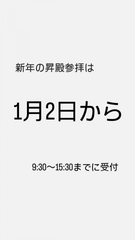お知らせ 新年の祈祷は2日から 令和5年12月1日 新年の昇殿祈祷は、2日より受付いたします。元日は受け付けておりませんのでご了承ください。1月2日より9:30〜16:00団体のご予約は事前にご連絡の上申し込み願います。 一覧へ戻る